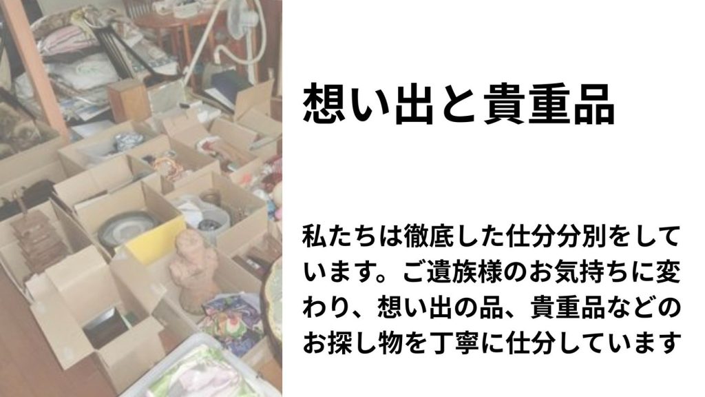 - 遺品整理: ご遺族様との対話を重視。一点ずつ確認しながら、新しい生活への区切り(心の整理)をサポート。