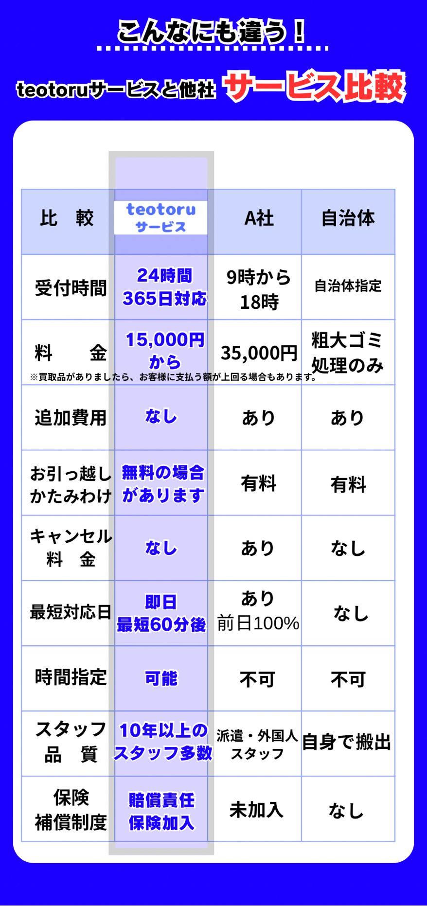 Q. 見積もり後に追加料金が発生することはありますか? A. いいえ、一切ございません。teotoruサービスでは、経験とデータに基づいた正確なお見積りをご提示し、ご納得いただいてから作業を開始いたします。当日に事前申告のない大量の追加品などがない限り、お見積り金額から変動することはありません。